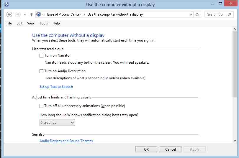- Setting Speech Options in Windows from Microsoft. Note that this URL currently describes how to do this in Windows 7. There are some differences in Windows 8, and the procedure given above accounts for these.